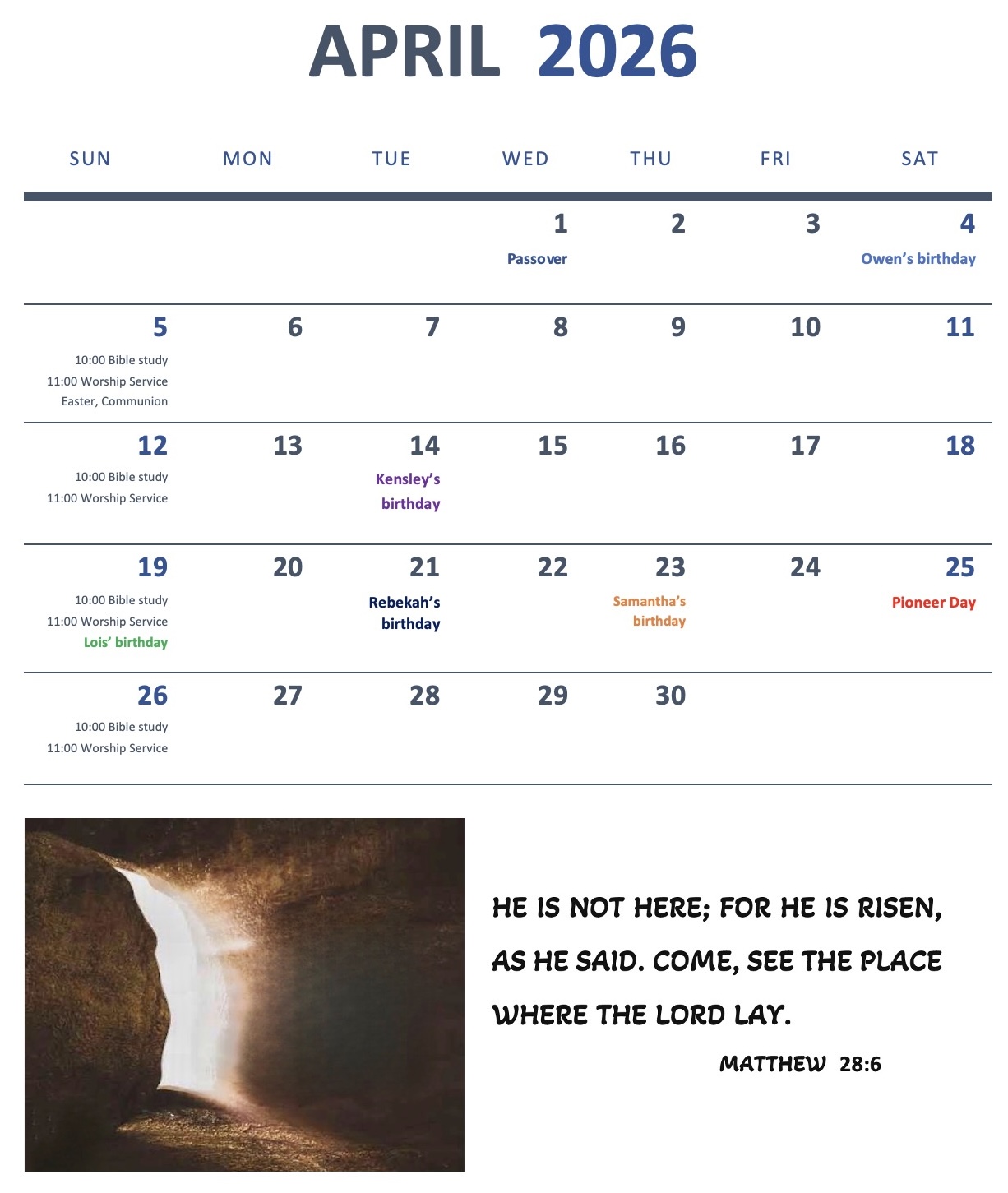 Bible study starts at 10 am with Louise Rust.